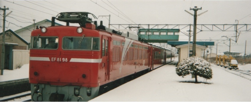 特急「北斗星」をけん引するEF81が、間合いで普通列車のけん引にも用いられていました。