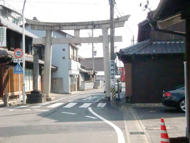 ところで、「中山道」を加納宿の方から進むと、変わった交差点があります。同道は細畑駅から名鉄各務原線と並走しますが、切通駅(「結婚塾」看板のある場所)と手力駅との中間にあたる地点で、正面に鳥居が建ち、中山道が左へ折れています。