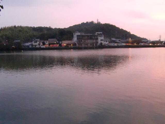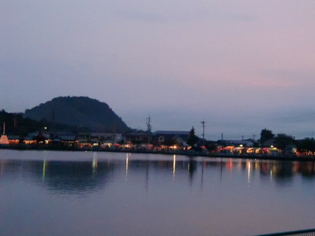 当日の池の外周・北東の道路から西側向きで撮影。池の周囲の道路沿いに夜店の灯火が並んだため、これが素敵なアクセントとなって印象深くなりました。