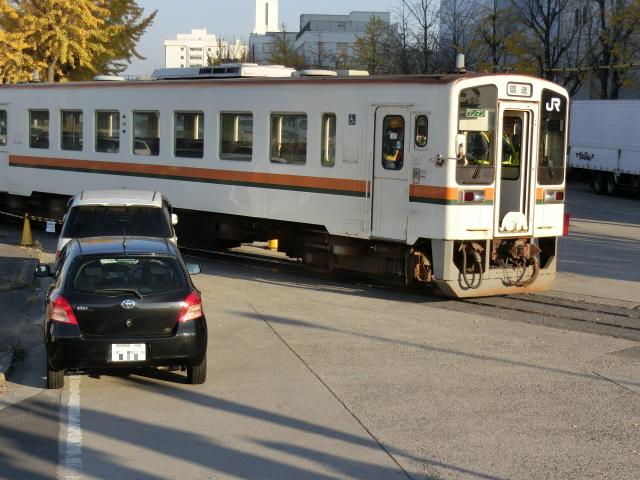列車は先日述べた名電築港の平面クロスを越え、北方向に突っ込んで停車し、向きを変えて名鉄築港線に合流します。普段の名鉄の列車は東名古屋港駅で折り返すため、その先の県道55号線の踏切から先を走る列車は滅多に見られません。同踏切を越え、ふ頭直前の複線区間では名電築港から先導となったND55210を切り離しました。その後はキハ11 2を先頭に進む姿も見られました。